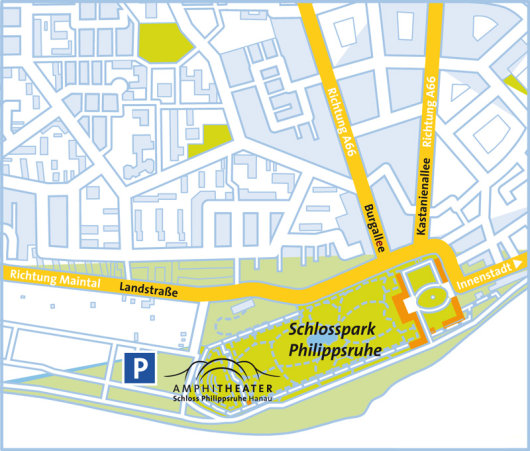 Das Amphitheater befindet sich am Ende des Schlossparks Philippsruhe. Folgen Sie der Beschilderung Brüder Grimm Festspiele Hanau oder der Beschilderung Amphitheater.